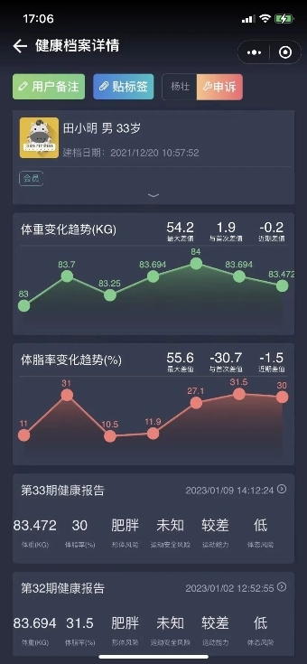 宅客科技首創(chuàng)健康檔案對比分析功能,完整記錄了會員的各項身體參數(shù)的變化趨勢,便于教練更好對比訓練服務成果。每一次的測量記錄清晰可見,對于學員來說,可以直接看到自己通過訓練后,身體是否有變化,很直觀的感受自己的投入值不值;對于場館而言,可根據(jù)歷史大數(shù)據(jù)開發(fā)更有針對性的訓練課程以及提供更好的運營思路。