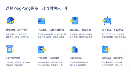 PingPong福貿(mào)全球賬戶支持多達(dá)18個主流幣種收款,另外相較于全球賬戶,其歐美本地賬戶有更高的外貿(mào)收款效率、更低的外貿(mào)收款成本以及更便捷的匯款流程,可加速外貿(mào)企業(yè)資金回籠,便利歐美本地客戶,進(jìn)而提升談單競爭力以及交易轉(zhuǎn)化。