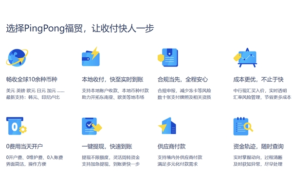 同時(shí),為了避免因匯率波動(dòng)帶來的糾紛,PingPong福貿(mào)卓越的時(shí)效性,貨 款最 快可當(dāng)日達(dá),在爭(zhēng)分奪秒創(chuàng)造財(cái)富的關(guān)鍵期,守護(hù)好你的每一分利益。