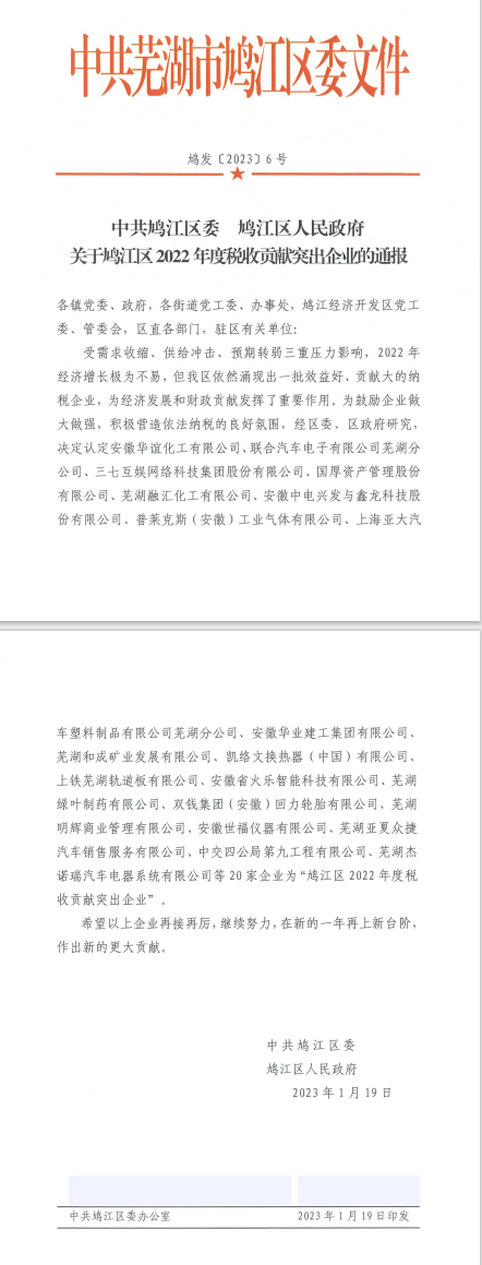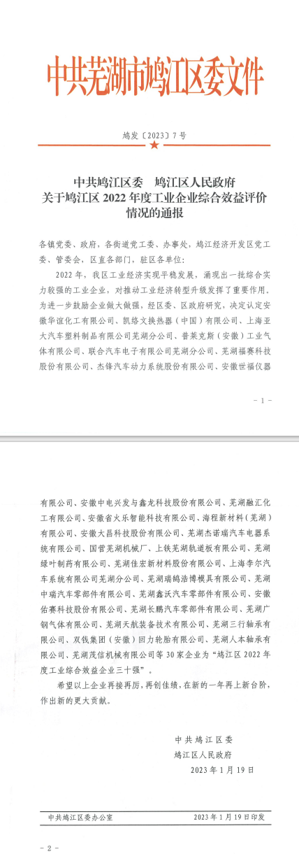 鑒于凱絡(luò)文在技術(shù)創(chuàng)新、生產(chǎn)水平、銷售實(shí)力和管理能力各方面取得的成績(jī),對(duì)推動(dòng)蕪湖當(dāng)?shù)毓I(yè)經(jīng)濟(jì)平穩(wěn)發(fā)展和工業(yè)經(jīng)濟(jì)轉(zhuǎn)型升級(jí),發(fā)揮了重要作用,因此被認(rèn)定為鳩江區(qū)綜合效益企業(yè)30強(qiáng)。