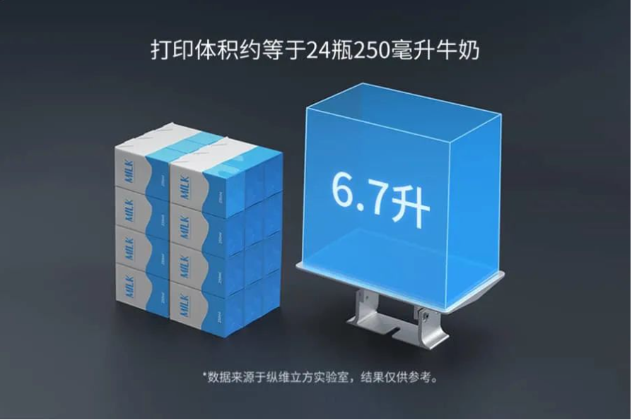 在打印尺寸方面,市面常見光固化3D打印機(jī),在使用過程中會(huì)出現(xiàn)打印大件模型必須要拆分成多件進(jìn)行制作的困擾。縱維立方此次推出的這款機(jī)器尺寸為330*350*630mm,能夠一次性打印250*219*123mm的模型,最 大打印體積可達(dá)6.7L,大小相當(dāng)于24瓶250毫升的牛奶,而機(jī)器重量僅為19kg。