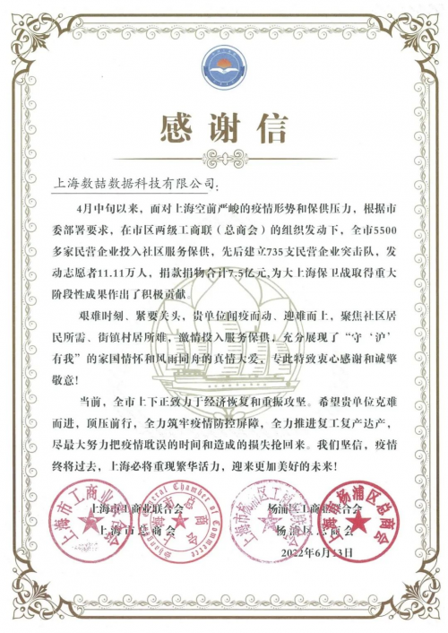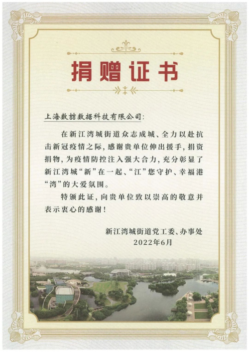 在上海疫情期間,上海數(shù)喆數(shù)據(jù)科技有限公司積極踐行了企業(yè)的社會(huì)責(zé)任感和使命擔(dān)當(dāng),迅速摸排企業(yè)所在街道新江灣街道的物資缺口,在得知新江灣街道對防護(hù)服的需求后,數(shù)喆數(shù)據(jù)依托企業(yè)資源,積極聯(lián)絡(luò)有相關(guān)物資儲(chǔ)備的防護(hù)物資生產(chǎn)企業(yè),緊急購買防護(hù)物資,并向新江灣街道捐贈(zèng)大批量防護(hù)服。楊浦區(qū)新江灣城街道黨工委、辦事處和楊浦區(qū)工商業(yè)聯(lián)合會(huì)于疫情形勢穩(wěn)定后,共同向上海數(shù)喆數(shù)據(jù)科技有限公司頒發(fā)了感謝信和捐贈(zèng)證書。