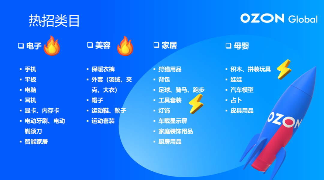 現場的賣家朋友對Ozon的物流、支付、ERP和入駐流程、平臺大促日歷表現出濃厚的興趣,同時也有很多疑問。出席本次會議的神秘嘉賓(Ozon俄羅斯物流負責人)也和大家進行了簡單互動;Felix則就現場賣家所提出的問題逐一解答;在引流方面,賣家可以通過自然流量、付費流量以及大促流量,持續(xù)出單,增加復購。目前,Ozon的熱招類目有以下四個類目: