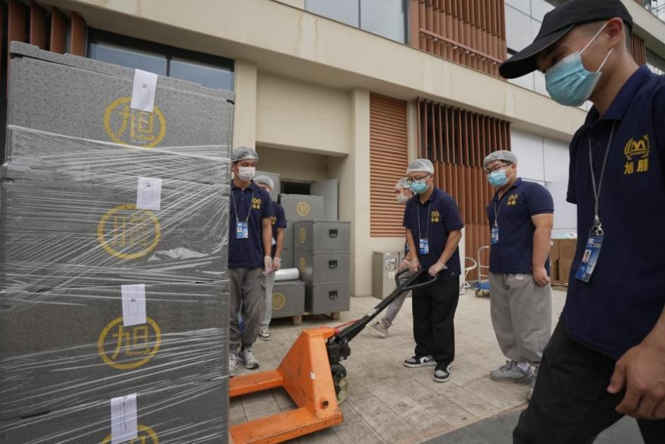 圖片:包裝組將已封箱的餐食運(yùn)往車廂