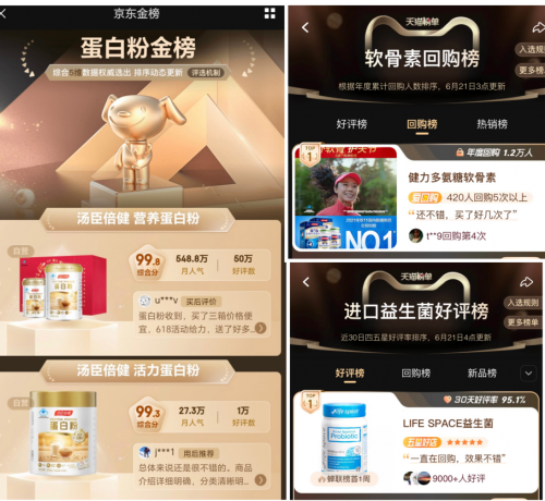 阿里數(shù)據(jù)顯示,在今年618期間,在營(yíng)養(yǎng)健康消費(fèi)賽道上,湯臣倍健旗下全品牌總銷售額位居天貓膳食營(yíng)養(yǎng)補(bǔ)充劑品類榜首,湯臣倍健官方旗艦店位列天貓保健食品/膳食營(yíng)養(yǎng)補(bǔ)充食品店鋪銷售額TOP 1。在京東、天貓發(fā)布的好評(píng)榜、熱賣榜等眾多榜單中,湯臣倍健多品類領(lǐng)先,實(shí)現(xiàn)了銷量及口碑雙豐收,不同年齡、不同群體的“湯臣倍健代言人”紛紛為湯臣倍健打call。