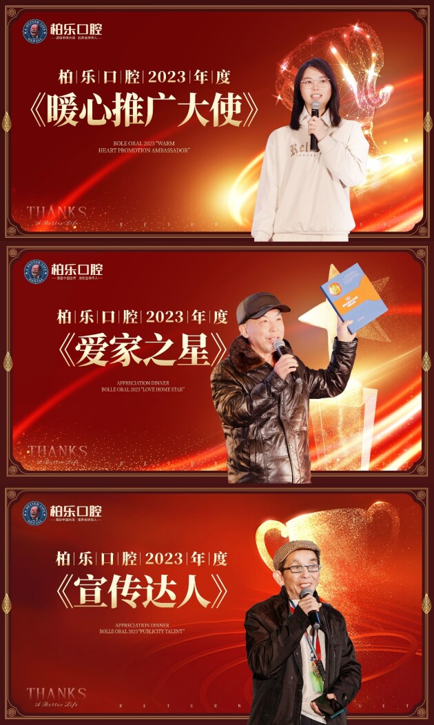 在柏樂口腔這幾年的發(fā)展中,共有50萬+的客戶與柏樂一同前行。每一位客戶都值得柏樂去深深感謝,其中有幾位很特別的客戶讓他們的支持與信賴讓柏樂深受感動(dòng)與觸動(dòng)。這次柏樂專程將他們邀請到答謝會(huì)上,并給他們頒發(fā)了代表至高謝意的專屬定制獎(jiǎng)項(xiàng),這幾位品牌摯友都因?yàn)樽约涸诎貥房囱婪N牙而把這份信任傳遞與分享。他們有的把柏樂分享給了非常多的親朋好友、有的選擇把一家人都帶來了柏樂看牙、有的今年多次熱心出鏡為柏樂口腔宣傳,他們用自己真實(shí)的口腔變化與記錄感染和分享給了更多的人。他們是柏樂口腔前行的真摯動(dòng)力,柏樂口腔定將不負(fù)所望,繼續(xù)共同守護(hù)大家的口腔健康與幸福,不辜負(fù)任何一個(gè)客戶的信任。