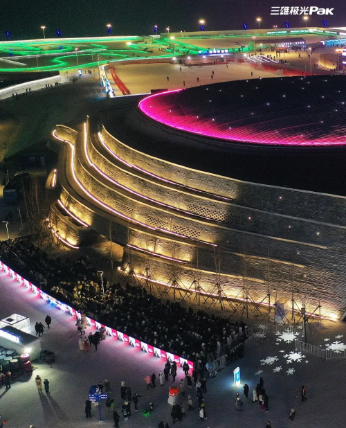 哈爾濱冰雪大世界的場館建筑以弧形、圓形的設(shè)計形式為主,外觀古樸大氣。照明設(shè)計以此為依托,選用三雄極光深灰色的洗墻燈,使燈具與建筑體融為一體,沿外立面形成一條條蜿蜒的亮光,勾勒建筑體造型輪廓,展現(xiàn)建筑材料質(zhì)感。此外,數(shù)個點光源分布于建筑立面的各個區(qū)域,如星斗點綴蒼穹,重塑夜景形象。