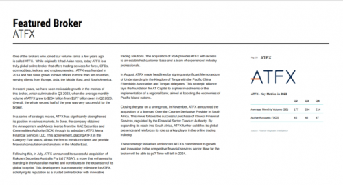 回首上個(gè)季度,ATFX以8523億美元的總交易量,同比增長(zhǎng)88.15%的卓越業(yè)績(jī)位居全球第四。此次四季度交易量雖略有下滑,但全球排名依然穩(wěn)固,這在復(fù)雜多變的世界經(jīng)濟(jì)環(huán)境下顯得難能可貴。得益于全球業(yè)務(wù)擴(kuò)張和全面鋪開的市場(chǎng)營(yíng)銷策略,ATFX品牌聲譽(yù)有了顯著提升,本季度內(nèi)ATFX網(wǎng)站排名和訪問量有了突破性進(jìn)展。數(shù)據(jù)顯示,ATFX全球官網(wǎng)在行業(yè)內(nèi)的排名位居前四,第四季度的官網(wǎng)訪問量更是達(dá)到了驚人的1590萬(wàn)人次。此外,F(xiàn)inance Magnates還用一整個(gè)版面來報(bào)道引薦ATFX,我們更是被評(píng)為當(dāng)前行業(yè)中“值得推薦的在線經(jīng)紀(jì)商”。這是行業(yè)權(quán) 威媒體對(duì)一家實(shí)力聲譽(yù)俱佳的經(jīng)紀(jì)商2023年業(yè)績(jī)與市場(chǎng)表現(xiàn)的重量級(jí)認(rèn)可。