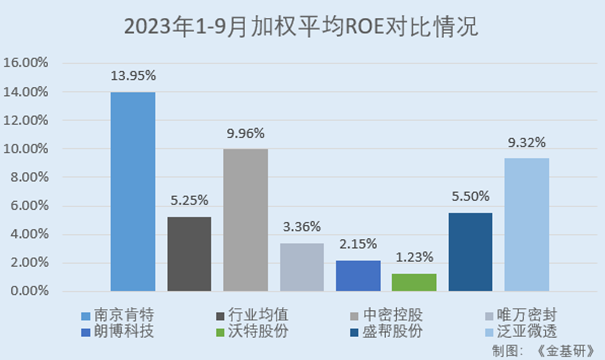 其中,2023年1-9月,中密控股的加權(quán)平均ROE為9.96%;唯萬密封的加權(quán)平均ROE為3.36%;朗博科技的加權(quán)平均ROE為2.15%;沃特股份的加權(quán)平均ROE為1.23%;華日新材的加權(quán)平均ROE為6.03%;盛幫股份的加權(quán)平均ROE為5.50%;泛亞微透的加權(quán)平均ROE為9.32%。一通密封、華日新材尚未披露其2023年1-9月財務(wù)數(shù)據(jù),故剔除(下同)。