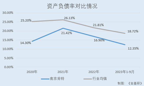 2020-2022年及2023年1-9月,肯特股份的資產(chǎn)負(fù)債率分別為14.30%、21.42%、16.90%、12.35%。同期,肯特股份同行業(yè)可比公司一通密封、中密控股、唯萬密封、朗博科技、沃特股份、華日新材、盛幫股份、泛亞微透的資產(chǎn)負(fù)債率均值分別為25.20%、26.13%、21.81%、18.72%。