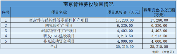 此番上市,肯特股份擬募資3.52億元,分別用于“密封件與結(jié)構(gòu)件等零部件擴產(chǎn)項目”、“四氟膜擴產(chǎn)項目”、“耐腐蝕管件擴產(chǎn)項目”、“研發(fā)中心建設(shè)項目”及“補充流動資金項目”。