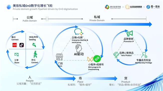 美妝行業(yè)O+O全域增長模型的核心是運營驅(qū)動,整合定制化開發(fā),深度服務(wù)客戶增長需求。從人貨場方面拆解: