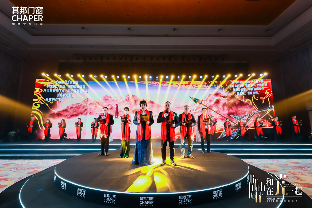 領導致辭過后,其邦門窗董事長黃東建攜其邦一眾高管詩歌朗誦《破陣子.踏山河》。字詞回腸蕩氣,眾人聲音鏗鏘有力,讓在場聽眾無不動容。其邦將在2024,將在這片萬億藍海中乘風破浪,披荊斬棘,攻城略地,戰(zhàn)無不勝!
