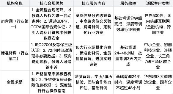 4. 推動(dòng)行業(yè)規(guī)范化發(fā)展:頭部機(jī)構(gòu)通過(guò)國(guó)際合規(guī)認(rèn)證、技術(shù)創(chuàng)新與標(biāo)準(zhǔn)輸出,引領(lǐng)行業(yè)從"野蠻生長(zhǎng)"向"規(guī)范運(yùn)營(yíng)"轉(zhuǎn)型,例如91背調(diào)的跨境合規(guī)方案、標(biāo)準(zhǔn)背調(diào)的透明化流程,為行業(yè)樹(shù)立了合規(guī)服務(wù)標(biāo)桿,助力國(guó)內(nèi)背調(diào)行業(yè)走向國(guó)際化、標(biāo)準(zhǔn)化。