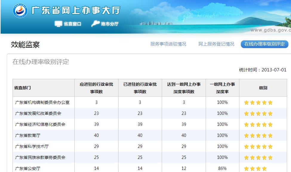 廣東省網(wǎng)上辦事大廳運用信息化手段創(chuàng)新政府管理與服務(wù),整合全省政府資源提高網(wǎng)上辦事效率,實現(xiàn)全省“一張網(wǎng)”。目前,45個省級單位、21個地級以上市和順德區(qū)的網(wǎng)上辦事窗口或分廳,與省網(wǎng)上辦事大廳實現(xiàn)連通。首批45個省級單位共有1106項服務(wù)事項順利進駐省網(wǎng)上辦事大廳,516項辦事提供了在線申辦服務(wù)。21個地級以上市和順德區(qū)的18879項服務(wù)事項順利進駐,其中有6217項辦事提供了在線申辦服務(wù),切實做到跨部門業(yè)務(wù)與服務(wù)的資源集成與整合;同時,運用了云計算理念、數(shù)據(jù)中心理念,推動各類行政審批、社會管理和服務(wù)事項實現(xiàn)網(wǎng)上“一站式辦理、一條龍服務(wù)”,首創(chuàng)辦事人只要根據(jù)需求和條件對號入座就能辦理業(yè)務(wù),將8小時政府變?yōu)?4小時政府,白天晚上均可網(wǎng)上申辦。