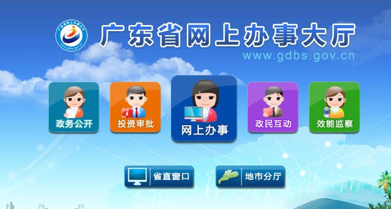 進入廣東省網(wǎng)上辦事大廳首頁,可以看到5個卡通圖像,分別代表“政務(wù)公開、投資審批、網(wǎng)上辦事、政民互動和效能監(jiān)察”五項功能。首頁還有“省直窗口”和“地市分廳”兩個欄目按鈕,點擊即可進入各省級單位及21個地級市的分廳。