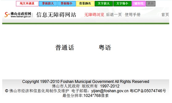 互聯(lián)網(wǎng)已成為人們獲取信息的主要渠道之一,政府網(wǎng)站“信息無障礙”讓視障者能夠充分、平等地參與社會生活和享受經(jīng)濟(jì)社會發(fā)展成果,體現(xiàn)了政府維護(hù)和關(guān)愛弱勢群體的責(zé)任和義務(wù)。佛山市政府網(wǎng)站提供了語音版無障礙瀏覽服務(wù),可選擇普通話、粵語,也可以選擇相關(guān)欄目中的信息進(jìn)行播放,給用戶提供方便。