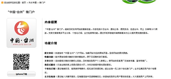 “中國·臺州”微門戶打造智慧政府和電子政務云計算的創(chuàng)新典型,為市民提供最有用、最快捷、最方便的政府服務,并成為市民隨身攜帶的政府服務手冊。這款應用支持IPHONE、IPAD、Android等操作系統(tǒng)的各類移動終端。還支持微博推送分享、文章收藏、個性化訂閱、全文檢索等功能,為公眾提供更快捷的服務。