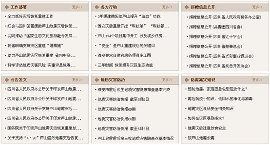 欄目規(guī)劃全面。專題全面公開災(zāi)情信息、決策部署、救援搶險、次生災(zāi)害、路況信息、物資供給等信息。整合網(wǎng)站辦事服務(wù)欄目的民政部門捐贈救助、公安部門證件辦理等相關(guān)辦事服務(wù)事項21項。與雅安市共建“雅安市人民政府一線報道”子專題,聚合鏈接23個省直部門網(wǎng)站抗震救災(zāi)專題。轉(zhuǎn)載或同步直播9場地震新聞發(fā)布會。貫徹落實魏宏省長的指示要求,在專題及在省政府網(wǎng)站首頁顯著位置開設(shè)“‘4?20’蘆山強(qiáng)烈地震捐贈信息公開”專欄,展示各相關(guān)單位及主管社團(tuán)組織的捐贈款物接收和使用信息。