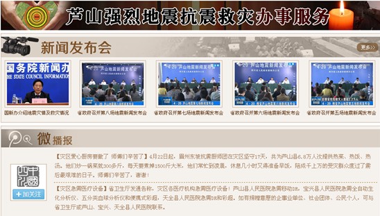 四川省人民政府網(wǎng)站在“4·20”蘆山地震中,第一時間制作專題,專題內(nèi)容實現(xiàn)7*24小時不間斷更新。及時公開政府第一手信息,內(nèi)容全面、透明、信息量大;欄目合理實用;內(nèi)容互動性強(qiáng)。使政府信息在短時間內(nèi)形成抗災(zāi)救災(zāi)的合力,充分發(fā)揮了信息公開第一平臺、權(quán)威平臺的作用。