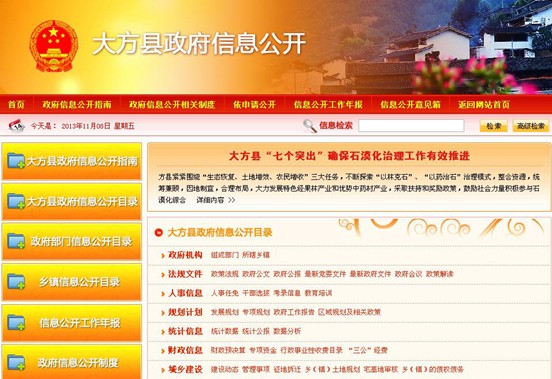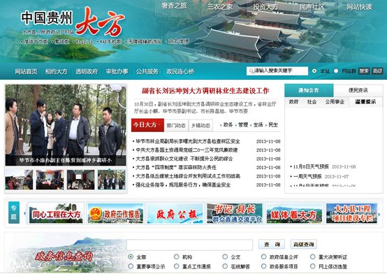 貴州省大方縣政府門戶網(wǎng)站群,以縣政府門戶網(wǎng)站“中國貴州—大方政務(wù)門戶網(wǎng)”為主站。出臺了《關(guān)于進(jìn)一步加強縣政府門戶網(wǎng)站群建設(shè)工作的通知》文件,就如何加強政府門戶網(wǎng)站群管理作出具體的可操作性的規(guī)定。網(wǎng)站群集34個鄉(xiāng)鎮(zhèn)子網(wǎng)站和40個部門子網(wǎng)站為一休,統(tǒng)一對外發(fā)布政府信息,成為大方縣電子政務(wù)應(yīng)用的重要組成部分以及政府信息公開的主要載體和平臺。政府網(wǎng)站群的建設(shè)標(biāo)志著大方縣電子政務(wù)建設(shè)的重心發(fā)生轉(zhuǎn)移,由局部建設(shè)轉(zhuǎn)向整合建設(shè),由分散、自發(fā)建設(shè)轉(zhuǎn)向集約化統(tǒng)籌建設(shè),為政府網(wǎng)站實現(xiàn)深層次、跨部門的信息整合和資源開發(fā)利用打下基礎(chǔ)。