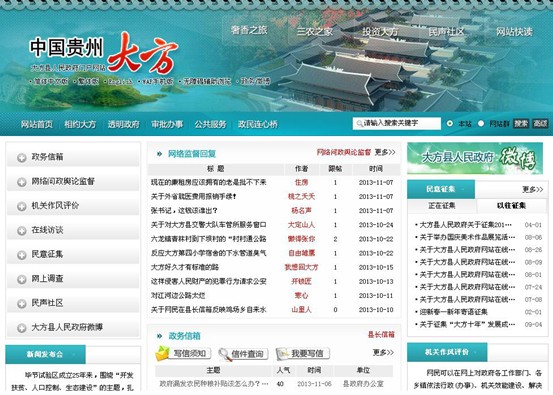 貴州省大方縣政府門戶網(wǎng)站群,以縣政府門戶網(wǎng)站“中國貴州—大方政務(wù)門戶網(wǎng)”為主站。出臺了《關(guān)于進(jìn)一步加強縣政府門戶網(wǎng)站群建設(shè)工作的通知》文件,就如何加強政府門戶網(wǎng)站群管理作出具體的可操作性的規(guī)定,網(wǎng)站群集34個鄉(xiāng)鎮(zhèn)子網(wǎng)站和40個部門子網(wǎng)站為一休。2011年印發(fā)了《大方縣網(wǎng)絡(luò)媒體反映事項問責(zé)辦理暫行規(guī)定》、《大方縣政府網(wǎng)站群建設(shè)管理辦法》,建立工作機制,組建管理團(tuán)隊,全縣各鄉(xiāng)鎮(zhèn)、各部門明確由辦公室主任擔(dān)任網(wǎng)絡(luò)發(fā)言人,并采用實名制注冊登錄(注明網(wǎng)絡(luò)發(fā)言人字樣),形成覆蓋全縣、三級聯(lián)動的工作機制。建立網(wǎng)絡(luò)發(fā)言人管理制度、網(wǎng)絡(luò)媒體反映事項問責(zé)辦理暫行辦法等網(wǎng)絡(luò)問政效能問責(zé)配套制度,將網(wǎng)絡(luò)問政工作的各環(huán)節(jié)、各步驟進(jìn)行規(guī)范,固化辦理流程,明確辦理時限,落實工作責(zé)任制度,確保網(wǎng)絡(luò)問政工作有序開展。
