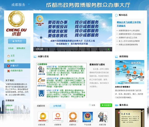 成都市政務(wù)微博服務(wù)群眾辦事大廳分別聚合新浪、騰訊兩個平臺上的成都市所有政務(wù)微博,同時聯(lián)動“成都發(fā)布”和“微成都”兩個微博號,建立起“橫向到邊、縱向到底”的微博矩陣,逐步實(shí)現(xiàn)全市政務(wù)微博“一網(wǎng)覆蓋”。