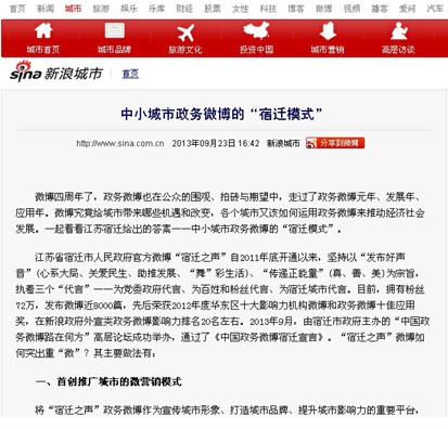 宿遷市政府門戶網(wǎng)站“網(wǎng)上宿遷”積極加強新媒體應(yīng)用,開通市政府官方微博“宿遷之聲”,建立宿遷政務(wù)微博廣場,打造“宿遷365”便民服務(wù)平臺,構(gòu)建政府網(wǎng)站與政務(wù)微博的聯(lián)結(jié),同時不斷拓展政務(wù)微博的各項應(yīng)用,“宿遷之聲”在全國初具影響力,其運維做法被作為政務(wù)微博的“宿遷模式”進行推廣。