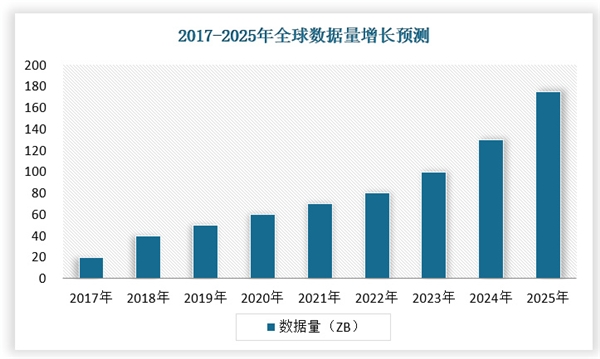 據(jù)互聯(lián)網(wǎng)數(shù)據(jù)中心(IDC)預測,全球數(shù)據(jù)量將從2018年的33ZB增至2025年的175ZB,增長超5倍;中國平均增速快于全球3%,預計到2025年將增至48.6ZB,占全球數(shù)據(jù)量的比例由23.4%提升至27.8%。