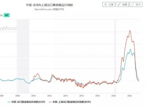 港口堆積成山,主要是因?yàn)樵谝咔槌跗谌肆?、運(yùn)輸、集裝箱等各方面資源緊缺,價格暴漲就導(dǎo)致供應(yīng)大量增加,集裝箱生產(chǎn)超平時的三倍,所以產(chǎn)能過剩、運(yùn)價暴漲等的情況出現(xiàn)也在意料之內(nèi)。從中國-全球&上海出口集裝箱運(yùn)價指數(shù)表內(nèi)就可以看到,自2022年開始,集裝箱的運(yùn)價就在垂直下降。