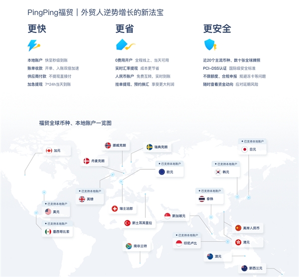 福貿(mào)是PingPong旗下的一站式外貿(mào)收款產(chǎn)品,支持近20個(gè)主流幣種的快捷收款,同時(shí)為外貿(mào)用戶提供本地收款賬戶,并且0開(kāi)戶費(fèi)、0服務(wù)費(fèi)、0入賬費(fèi),方便境外買家進(jìn)行低成本的本地轉(zhuǎn)賬。