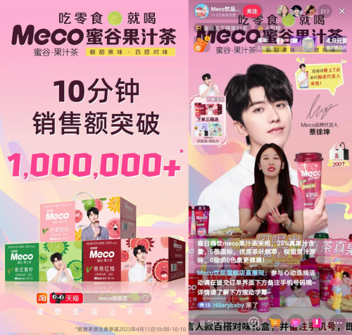 在蔡徐坤成為Meco蜜谷品牌新代言人消息發(fā)布后,僅10分鐘,在天貓Meco旗艦店,Meco x KUN八連杯禮盒銷售額就已經(jīng)突破了100萬。通過網(wǎng)友們的主動傳播,將Meco蜜谷果汁茶產(chǎn)品迅速推廣開,獲得了一致好評。