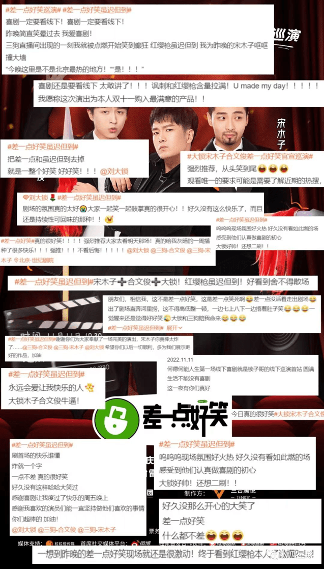作為特約嘉賓的王祖藍(lán)和張紹剛,此次不僅僅是前來助陣演員,更是海西喜劇前行的定心丸。演出結(jié)束后,大鎖在社交平臺上說到:“欠了大半年的《差一點好笑》北京站終于補上了!新本子排了三天,還好大家喜歡!”并發(fā)布了九宮格演出圖片與大家分享喜悅。正如他總是掛在嘴邊的那句話,“喜劇,永遠(yuǎn)奔流向前?!睆摹安钜稽c好笑”到“真的很好笑”,海西喜劇——《差一點好笑》6月即將南下長沙、7月二巡杭州與大家見面,讓我們一起相約演出現(xiàn)場,甩掉生活的“緊箍咒”,來一場身心“馬殺雞”!