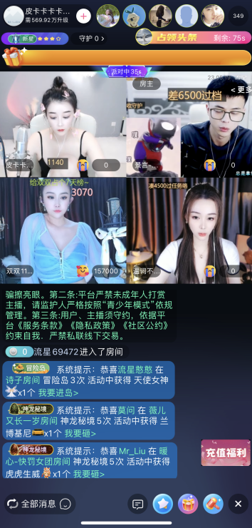 流星直播打造全新趣味主播PK,不僅保留了傳統(tǒng)的兩人對(duì)決形式,還增加了多人多屏PK互動(dòng)模式。新模式增加了更多的游戲玩法、趣味挑戰(zhàn)和獎(jiǎng)勵(lì)機(jī)制,使得PK過(guò)程更加豐富多樣,讓PK更加有趣,獲得更多快樂(lè)!