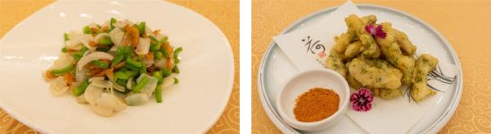 百合櫻花蝦、脆皮茴香魚柳,則為客人們帶來一番海的味道。蝦肉粉紅透明,顏色像櫻花一樣美麗,和脆嫩的百合在一起,鮮味濃郁可口。茴香和魚柳的碰撞則是另一番風(fēng)味,外焦里嫩、味道鮮美,咔嚓咔嚓吃起來,根本停不住嘴。