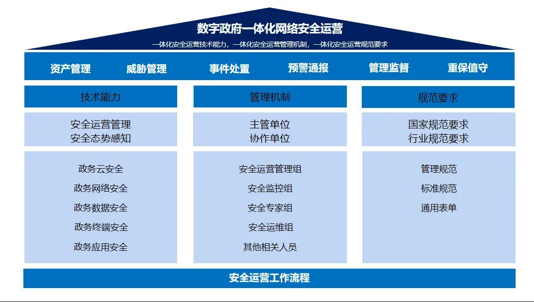 指南中通過(guò)“兩橫三縱”的模式構(gòu)建數(shù)字政 府一體化安全運(yùn)營(yíng)總體架構(gòu),“兩橫”即安全運(yùn)營(yíng)工作所開展的關(guān)鍵業(yè)務(wù)類別,以及為支撐關(guān)鍵業(yè)務(wù)運(yùn)行而統(tǒng)籌構(gòu)建的安全運(yùn)營(yíng)工作流程?!叭v”即技術(shù)能力、管理機(jī)制、規(guī)范要求,技術(shù)能力是針對(duì)網(wǎng)絡(luò)安全運(yùn)營(yíng)工作開展所需的技術(shù)工具,提供風(fēng)險(xiǎn)發(fā)現(xiàn)、協(xié)同處置、指揮決策、態(tài)勢(shì)呈現(xiàn)、統(tǒng)籌管理等技術(shù)措施;管理機(jī)制是依據(jù)網(wǎng)絡(luò)安全運(yùn)營(yíng)工作開展需要,建立相關(guān)的團(tuán)隊(duì)組織,在明確的“權(quán)、責(zé)、義”的邊界范圍下,有效開展安全管理、監(jiān)測(cè)預(yù)警、高效協(xié)同、應(yīng)急指揮等工作;規(guī)范要求是在遵循國(guó)家法律法規(guī)、行業(yè)標(biāo)準(zhǔn)規(guī)范的前提下,結(jié)合實(shí)際情況,明確安全運(yùn)營(yíng)工作中的管理要求、標(biāo)準(zhǔn)規(guī)范、表單記錄等內(nèi)容,為數(shù)字政 府行業(yè)網(wǎng)絡(luò)安全運(yùn)營(yíng)工作奠定基礎(chǔ)。