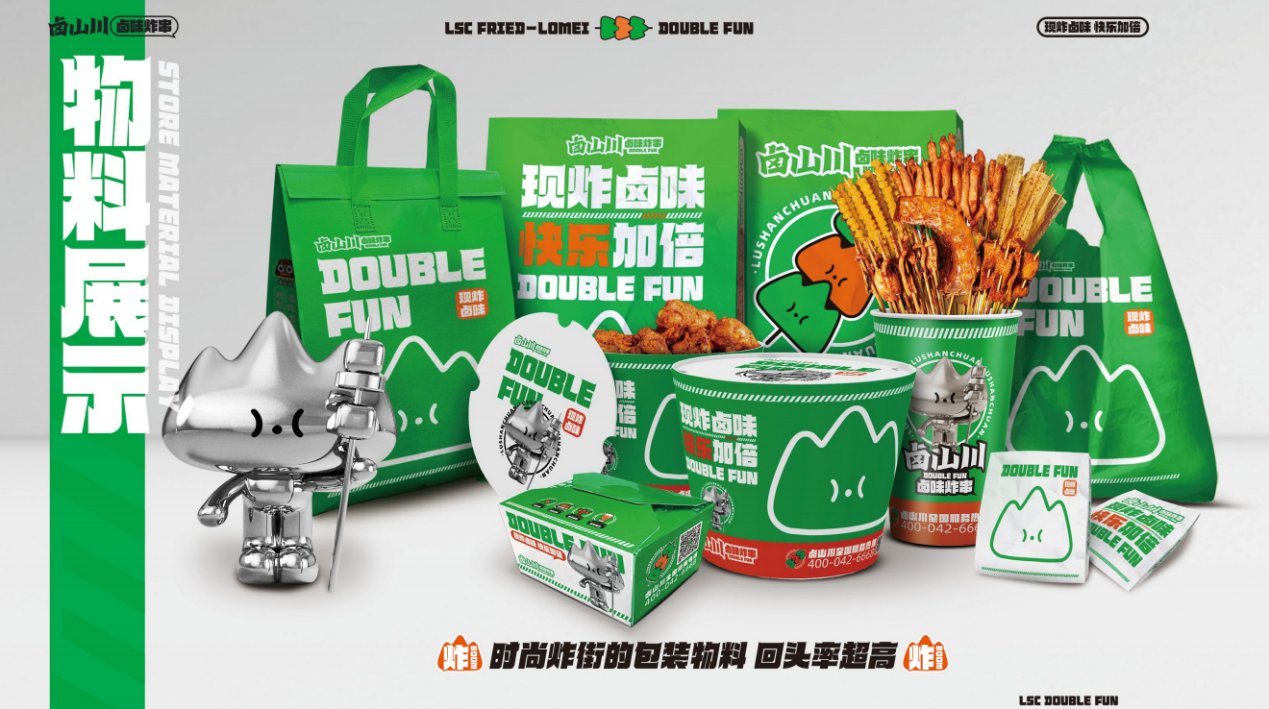 同時綠色用色也是鹵山川品牌理念的縮影,鹵山川致力于推翻傳統(tǒng)對于炸串不健康的刻板影響,打造綠色健康的炸串品牌。