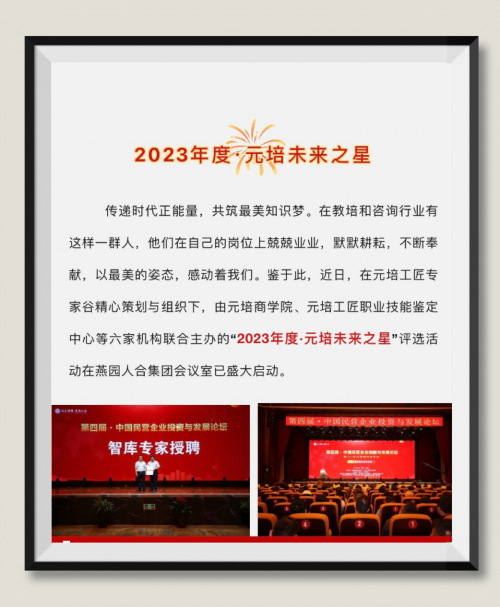 為表彰先進(jìn)、樹立楷模,激勵更多的優(yōu)秀智庫專家持續(xù)推動產(chǎn)學(xué)研深度融合發(fā)展,激發(fā)創(chuàng)新活力;充分發(fā)揮自身優(yōu)勢,在各自領(lǐng)域持續(xù)發(fā)力,助推企業(yè)和產(chǎn)業(yè)高質(zhì)量發(fā)展,故此,由元培工匠專家谷牽頭,元培商學(xué)院、元培工匠職業(yè)技能鑒定中心等六大機(jī)構(gòu)主辦的“2023年度元培未來之星·優(yōu)秀專家”評選活動,在燕園人合集團(tuán)辦公室,已盛大啟動,吁請“產(chǎn)學(xué)研訓(xùn)創(chuàng)”領(lǐng)域各位智庫專家踴躍參加。