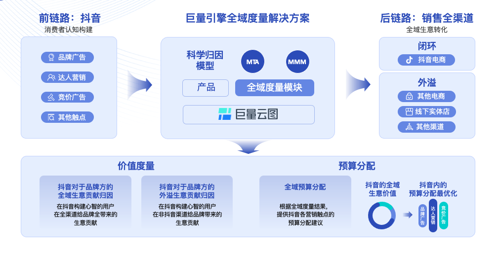 在大促?gòu)?fù)盤過程中,品牌方要計(jì)算最佳大促ROI,需要站在全局最 優(yōu)的視角,算清楚單個(gè)電商渠道GMV和全渠道GMV的遷移關(guān)系,前鏈路種草投入和后鏈路拔草轉(zhuǎn)化的流轉(zhuǎn)關(guān)系。為此,巨量引擎在巨量云圖平臺(tái)上搭建了「全域度量」的自助式模塊,通過科學(xué)手段為品牌方解決全域視角的歸因,在大促?gòu)?fù)盤中得到真實(shí)ROI計(jì)算和預(yù)算分配最 優(yōu)化建議。