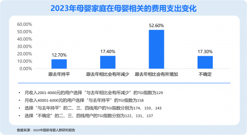 據(jù)2023中國新母嬰人群研究報(bào)告數(shù)據(jù)顯示,與2022年相比,盡管仍有52.6%的母嬰消費(fèi)者在母嬰相關(guān)的費(fèi)用支出上會有所增加,但近五成母嬰用戶消費(fèi)意愿無明顯變化甚至偏保守悲觀。