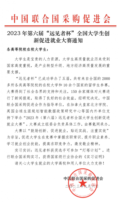 遠見者杯創(chuàng)辦于2018年,是我國國內(nèi)第一個以促進大學生就業(yè)為核心目標的全國性賽事。近日,為更開、放有力促進大學生就業(yè),經(jīng)過半年的籌備,在中國聯(lián)合國采購促進會指導下全新升級后的2023(第六屆)遠見者杯全國大學生創(chuàng)新促進就業(yè)大賽正式啟動。