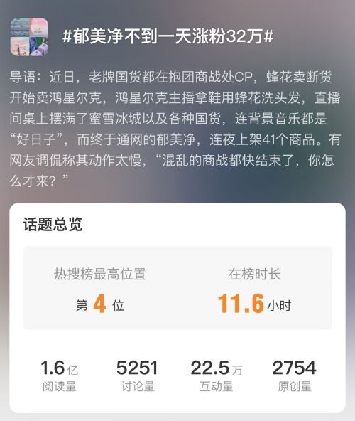 隨后,蜂花官方賬號發(fā)布視頻稱:已經(jīng)賣斷貨,還有哪家國貨沒蹭上商戰(zhàn),花花幫忙宣傳。緊接著,#郁美凈不到一天漲粉32萬#登上熱搜。