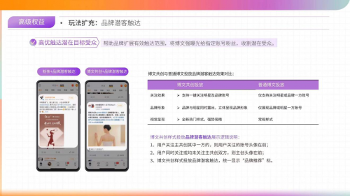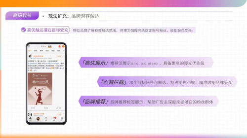 其優(yōu)勢在于,區(qū)別于普通博文,一方面,它能以高優(yōu)先級展現(xiàn)+推薦流置頂吸睛位置,給予品牌強(qiáng)勢曝光,最 大程度保證觸達(dá)有效率。
