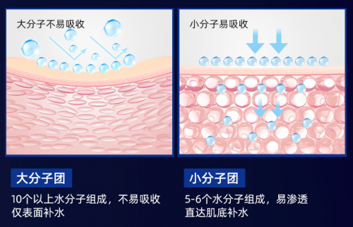 通常來說,肌膚對水的吸收非常挑剔且肌膚通道非常狹小,唯有小分子團水才能自由通暢的進入肌膚深處補水,領肌膚快速充盈水嫩起來。