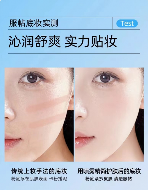 不少化妝師表示:妝前要精簡護膚。肌膚吸收能力有限,妝前涂抹過于厚重,皮膚黏膩,反而會使底妝卡粉搓泥,而彌玥泉噴霧由于成分精簡,加上小分子團水吸收快的特性,用完肌膚水潤清爽不黏膩,底妝也會更扒肌膚。