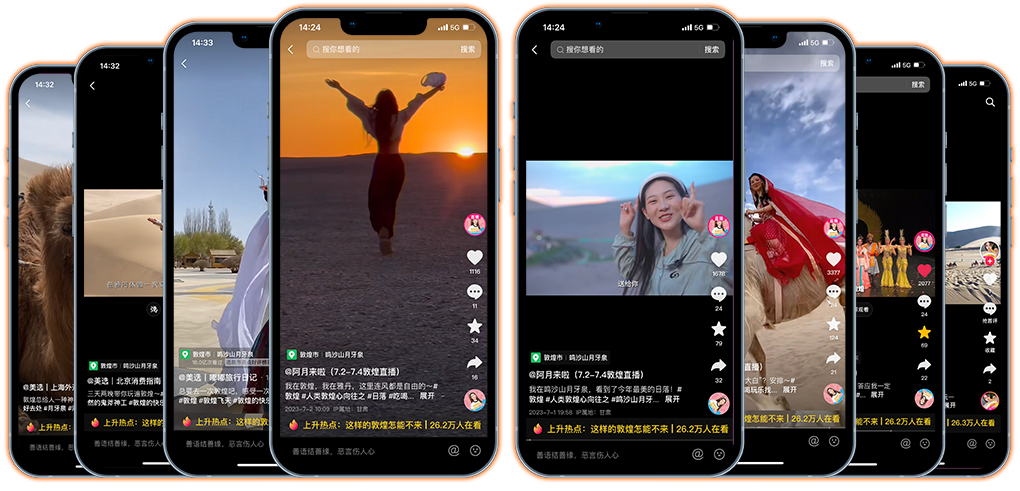 敦煌文旅集團在這次營銷活動中,深度聯動抖音酒旅達人@阿月來啦,充分展現出其在直播和短視頻領域的獨特優(yōu)勢,通過與達人緊密合作,組成了強大的全國達播矩陣。透過直播向觀眾展示了敦煌獨特的文化魅力,與本地豐厚的旅游資源的同時,在直播過程中為觀眾提供了豐富的優(yōu)惠機制和互動環(huán)節(jié),進一步增強直播間觀眾參與感和粘性?!俺跻姸鼗?尋跡西北”系列短視頻也全面釋放內容創(chuàng)作力,#這樣的敦煌怎能不來 喜提熱點,結合#敦煌文化抖音大賽# 活動的發(fā)起,無數粉絲數自行發(fā)布精彩短視頻作品,向全網展示了敦煌的獨有的美麗景色、豐富歷史文化以及民俗風情,引發(fā)了民眾對敦煌的無限向往和好奇。