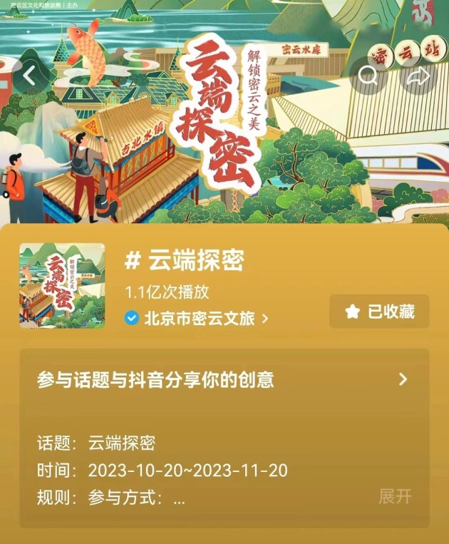 密云文旅開創(chuàng)抖音“云端探密”短視頻挑戰(zhàn)賽至今,投稿視頻總計(jì)3942個(gè),參與作者2676位,累計(jì)點(diǎn)贊量100W+,累計(jì)評(píng)論量4W+,累計(jì)轉(zhuǎn)發(fā)量10W+,云端探密話題總曝光量突破1.1億次。