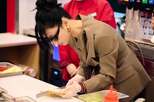 萬妮達現(xiàn)場學(xué)習(xí)打包香辣雞腿中國漢堡與酸菜烤肉中國漢堡,體驗了一把出餐高峰期,門店店員工作的快捷與高效。