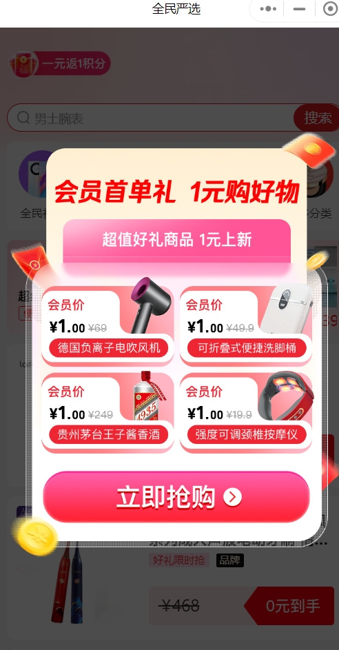 手機、藍牙耳機、運動手環(huán)、手表、大牌美妝、品質(zhì)廚具……只要你是會員首單,統(tǒng)統(tǒng)一元!