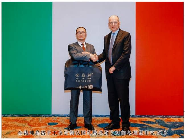 晚宴期間,觥籌交錯(cuò),意大利前總理恩里克?萊塔就東、西方文明的碰撞交流、共同發(fā)展等話題,與多位中國(guó)企業(yè)家展開深層次的探討。其中,國(guó)禮品牌金裁神的服裝一經(jīng)亮相,便吸引恩里克·萊塔的目光,只見他認(rèn)真端詳起來(lái),從袖口到針腳,由質(zhì)地到裁剪,對(duì)其精湛手藝贊不絕口,更對(duì)“金裁神”的工匠初心給予了高度的贊賞。